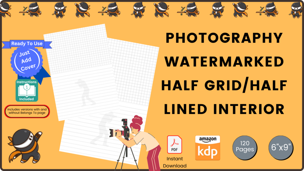 120 Page Amazon KDP Interior - Photography-themed Watermarked 6”x9” Half Grid Half Lined (PDF download)