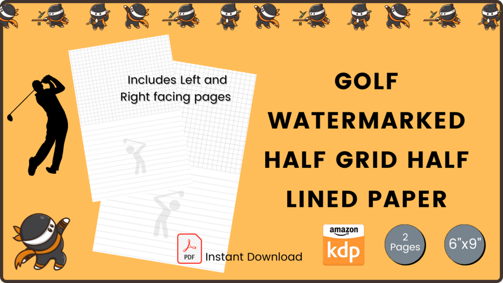 Two sheets of Golf-themed Watermarked 6”x9” Half Grid Half Lined Paper. Features facing left and right pages. Free to download and print for your own use, or create a multi-page document to use as a KDP interior.
